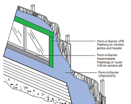 Perm-A-Barrier® VPS is vapour permeable for wall assemblies requiring this breathable characteristic. As a vapour permeable membrane, Perm-A-Barrier® VPS permits the diffusion of water vapour that may otherwise condense in the wall structure; but is impermeable to liquid water, which allows the material to act as a water drainage plain. Perm A Barrier VPS Flashings come in 4”, 6”, 9”, and 12” widths.