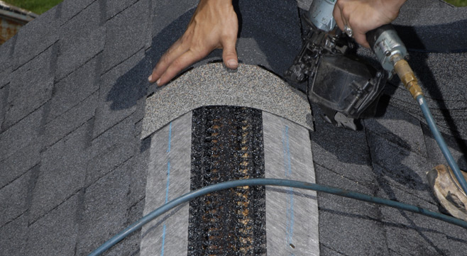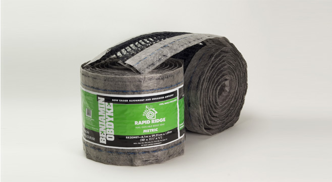 With a unique, low-profile design that easily installs with a pneumatic roofing nail gun, Benjamin Obdyke’s Rapid Ridge® nail-gunnable ridge vent offers the quickest installation of any rolled ventilation product on the market.