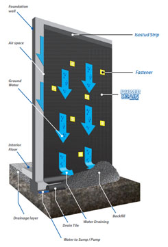 PowerDrain™ Isostud provides a capillary break to reduce ground water & other moisture penetration and helps foundations stay dry. The product protects the dampproofing so it can perform and as it is made of high density polyethylene (HDPE) it was designed for long-term durability.